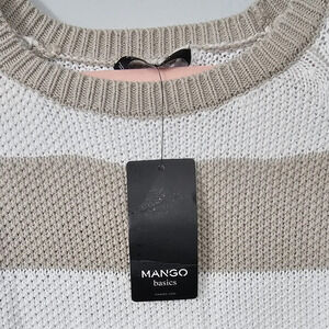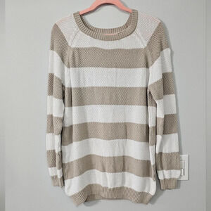 This stylish crew neck sweater features a bold striped pattern in white and tan, with long sleeves that are slightly gathered at the wrists. The soft knit material offers comfort and warmth, making it a perfect choice for casual outings.