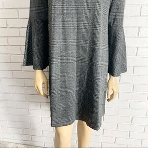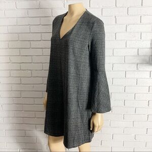 Dress by Mango, easily dressed up or down. All-over checked print, V-neck, Flared sleeves, Slip-on style, Regular fit, A standard cut for a classic shape. Length 34”. Armpit to armpit measurement lying flat 21”. Never worn.