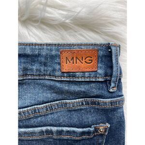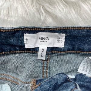 Keywords: Mango shorts, cut-off shorts, blue denim, women's fashion, size 2, distressed detail, cuffed hem, casual wear, summer style, five-pocket design, medium wash, MNG leather patch, new with tags, beachwear, weekend outfit.