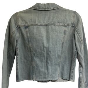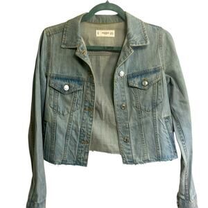 Mango women’s XXS cropped distressed raw hem boxy denim jean jacket, silver colored buttons. 100% cotton