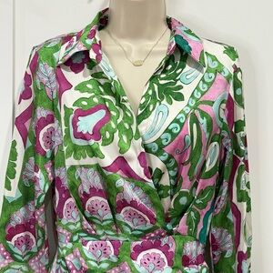Mango Wrapped Satin Mini Dress Floral Long Sleeve Collared Green Purple Small