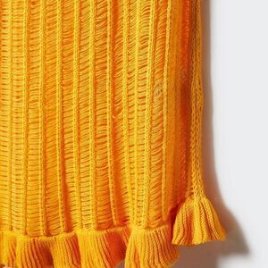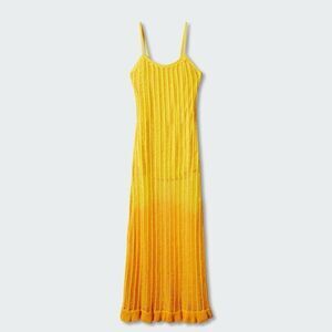 Vibrant maxi dress with spaghetti straps. Features a gradient from yellow to orange. Perfect for summer outings.