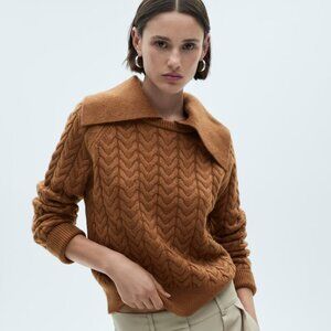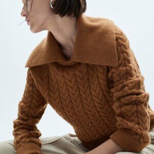 Knitted fabric. Cable knit. Straight design. Lapel-collar. Long sleeves. No closure. The model is 1.79 tall and is wearing a size 36.