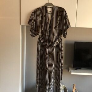 Worn once to an event got soooo many compliments. Front is 1st image back is last. For tall person. I’m 5ft 3 and wore with platform shoes and pant leg was off the ground.