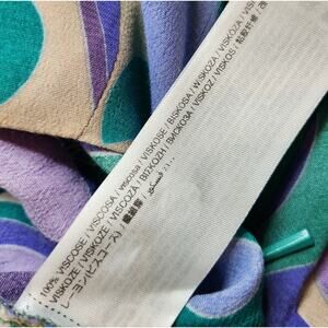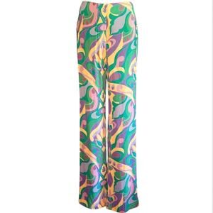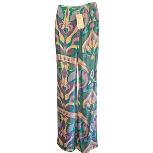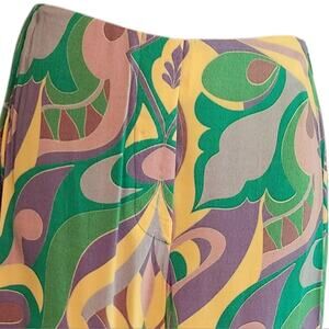 Bright hues and geometric designs add a little '70s twist to these airy trousers. Green, purple, and tan, mod pattern and cut. 100% viscose, dry clean or machine wash, line dry. Excellent condition, new with tags.