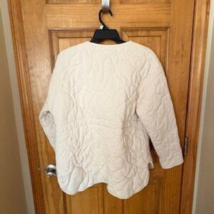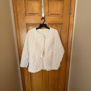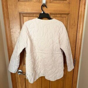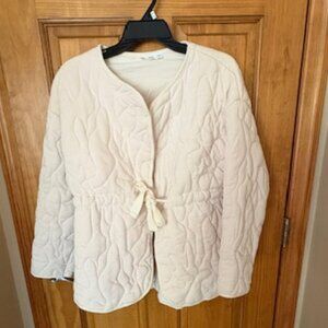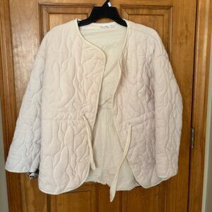 Mango quilted tie jacket. Color is cream. Fabric is cotton outside, viscose inside and polyester filling. Drawstring tie front closure. Machine wash cold, flat dry. Size medium measures approx. 23" ptp, length 26.5' from center back neck. Warm enough for fall and mild winter weather.