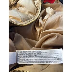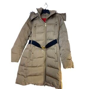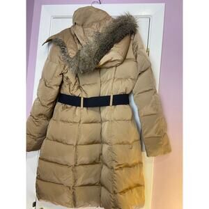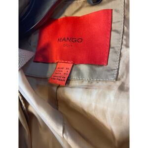 Mango winter coat , size XL, new without tags, never worn . Zipper pulls still have plastic attached . Lining is grey duck down feathers . Color beige . Belt and hood , that detached .