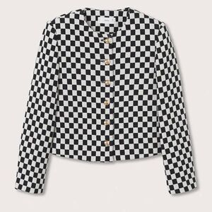 Committed Collection. Cotton-blend fabric. Textured fabric. Straight design. Short design. Rounded neck. Long sleeve. Metallic buttons. Inner lining. Button fastening on the front section.