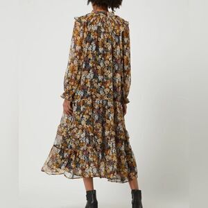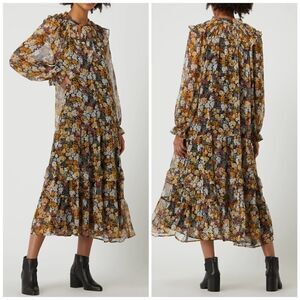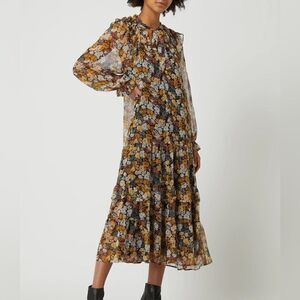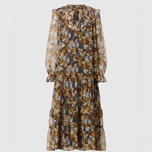 Light fabric. Sheer fabric. Flared design. Midi design. V-neck. Long sleeve. Bow fastening on the neck. Inner lining.