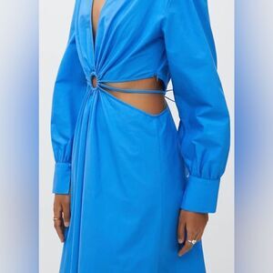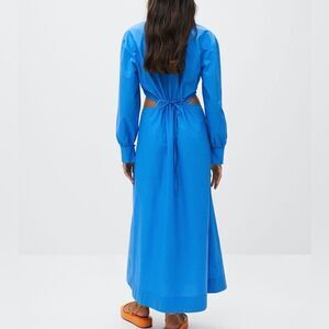 Committed Collection, 100% cotton fabric, Evasé design, Long design, V-neck, Hoop detail on the neckline, Side slits, Long sleeve, Side zip fastening, Bow closing on the back.