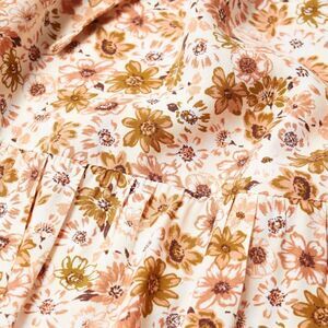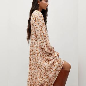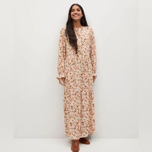Flowy fabric. Maxi dress design. Long design. Flared design. Floral print. V-neckline with ties. Long puffed sleeves. Elastic cuffs. Party and events collection.
