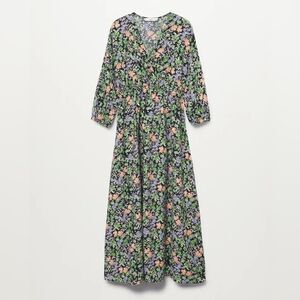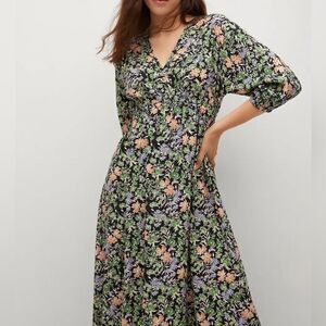 Flowy fabric. Midi design. Flared design. Printed design. Floral print. V-neck. Three quarter sleeve. Elastic waist.