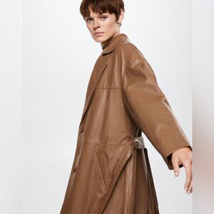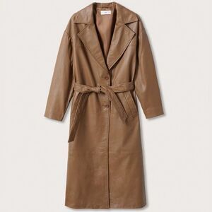 Online Exclusive. 100% Leather. Straight design. Long design. Lapel-collar V-neck collar. Long sleeve. Adjustable belt. Two side pockets. Button fastening on the front section. Inner lining.