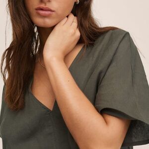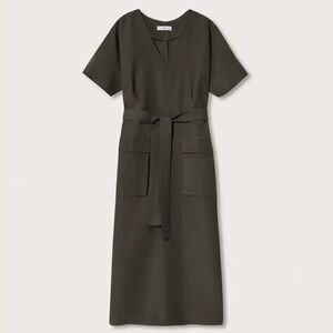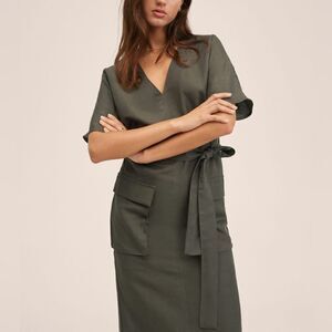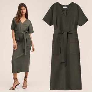Mango Linen Khaki Green Color Dress Belted Pockets