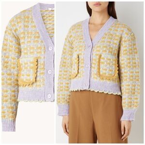 Knitted fabric. Multicolor design. Straight design. V-neck. Long sleeve. Button fastening on the front section. Two patch pockets on the front.