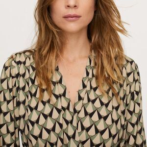 Straight design. Crossover design. V-neck. Long puffed sleeves. Buttoned cuffs. Elastic pleated on the waist.
