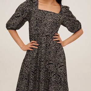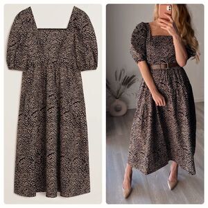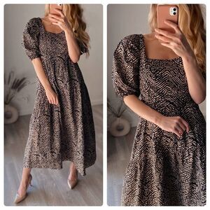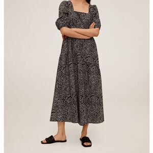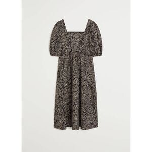 Long design. Flared design. Cotton fabric. Print. Square neckline. Puffed short sleeve. Gathered detail. Elastic back.