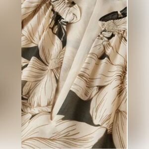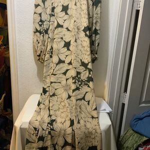 Mao neckline, Lining only, Unclosed, Light fabric, Floral print, Long design, Evasé design, V-neck, Long sleeve, Ruffles detail on the neck, Inner lining.
