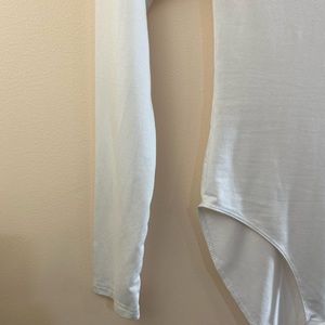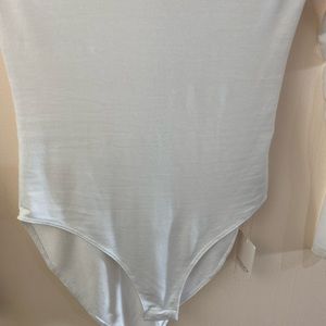 NWT mangopop bodysuit in white with a mock neck top. Long sleeves made of lightweight and soft cotton. Size XS. has two snaps at the bottom.