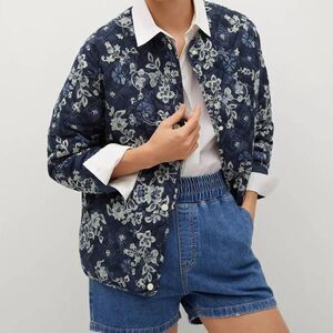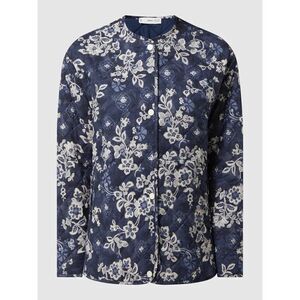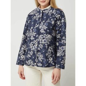 Quilted design. Straight design. Medium design. Printed design. Rounded neck. Long sleeve. Side pockets. Press stud fastening. Inner lining.