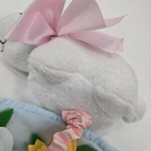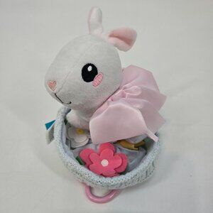 This Manhattan Toy piece is a musical pull toy or stroller toy of a plush, white bunny rabbit with an embroidered face, large pink bow around its neck, sitting in a blue, knit basket with multicolor flowers inside. It also has a loop on the top, a plastic heart link on the bottom, and makes lullaby music when pulled. Such an adorable plush toy for your little one's Easter basket!