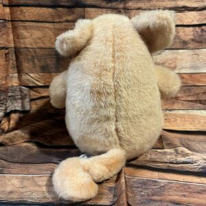 Design Details: Features soft, tan or beige-colored faux fur, a prominent snout, and a somewhat "humped" or hunched posture when sitting. It has dark plastic eyes and floppy ears.