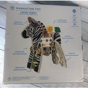 This 3 piece wooden toddler activity toy is perfect for hands on learning fun. Motor skill activities include bead runs, springy flower and bird, spinning gears and turning knobs. Safari theme zebra engages your little one's imagination and complements any nursery or playroom. Wooden activity center features a water-based, non-toxic finish. Wooden toddler toy for ages 12 months and up, measures 12" x 6" x 13".
