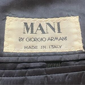 Mani by Giorgio Armani Black Vintage Suit Jacket Size 44 Long. Excellent pre-owned condition. 2 button front closure. 3 front pockets. 3 inside pockets. Material tag is faded but shell appears to be 100% wool and interior lining viscose. Measures approximately chest 44", length 32.5", sleeve 26.5".