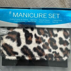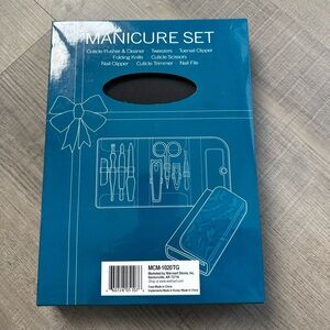 set is nwt, comes with cuticle pusher & cleaner, tweezers, toenail clipper, folding knife, cuticle scissors, nail clipper, cuticle trimmer & nail file.