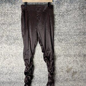 Features: Wide waistband; stretchy fabric for comfort; ruched stacked legs; sleek satin-like sheen; back welt-style detailing