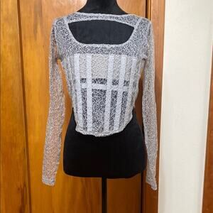 Maniere De Voir Sheer Gray Lace Abstract Pattern Long Sleeve Top Corset Zip Back