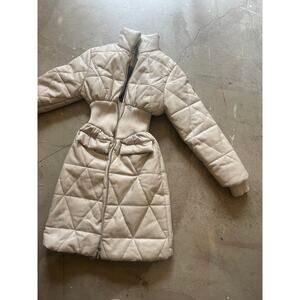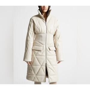 Featuring a cream color and corset waist, this vegan leather puffer coat is perfect for any occasion.