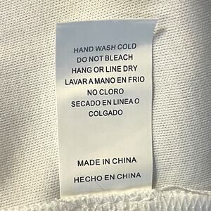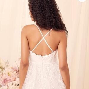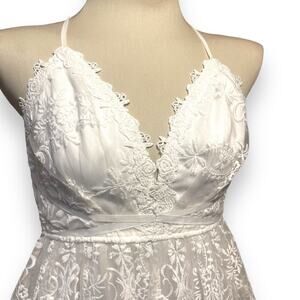 Fully lined white lace with a deep V-neckline, gathered waist with ribbon detail, adjustable spaghetti straps that crisscross sin the back, hidden back zipper with hook and eye closure
