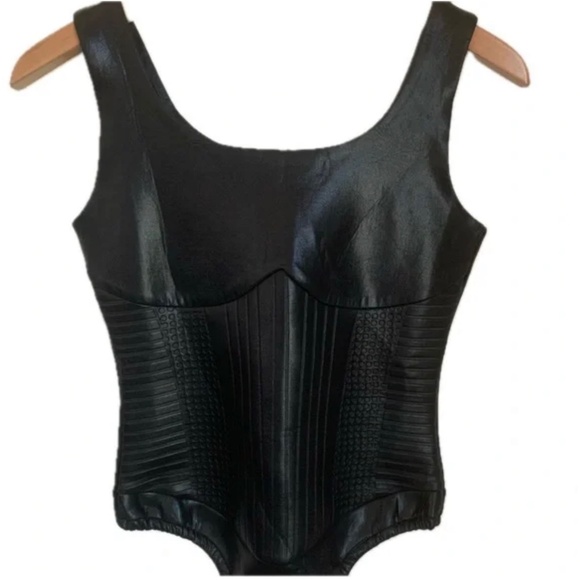 Manière De Voir Leather effect sleeveless bodysuit with back zip and underwear line snap. Ive only worn this once or twice. It has the new feel still.
