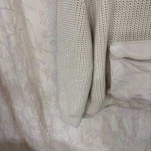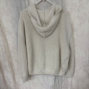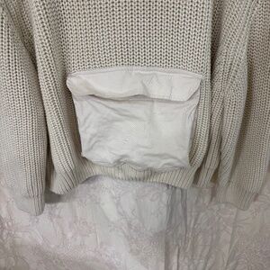 This oversized, baggy knit sweater by Mango is perfect for Spring, Fall, or Winter. Made of 50% cotton and 50% acrylic this sweater is well made, soft to the touch and comfortable. Long sleeve, round neck, baggy, hooded large front pocket, with a ribbed knit this sweater gives off casual, outdoor , fisher core vibes. Perfect for a bonfire, camping, a casual stroll,or casual event. Cream in color this sweater can be paired with any color palette or any design.. Great with jeans, skirt or over a dress. Clean. No rips or stains. Smoke free home.