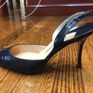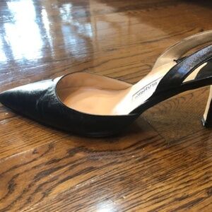 Gently used Manolo Blank Black Leather Sling-Back Pumps 3" heel in size 37.5. Sole shows wear otherwise great condition.
