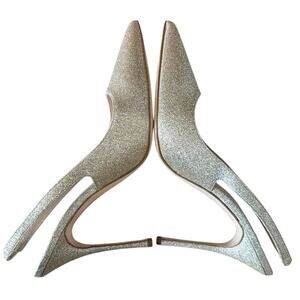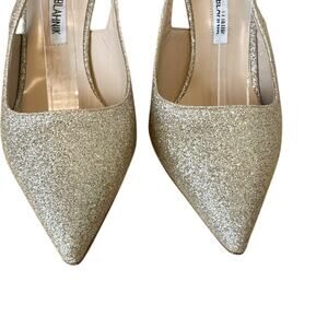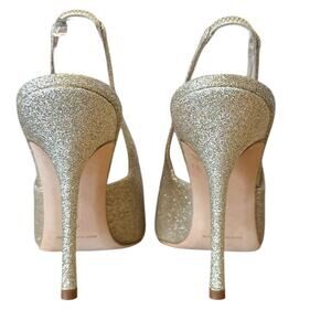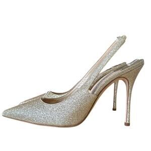 Picture's do not do these justice, they sparkle so so bright and beautifully in the light/sunlight. They are a champagne, slightly gold ( up close sparkles are gold and silver) with an elastic slingback for extra comfort. Gorgeous for a wedding day bridal shoe or any fancy/formal occasion. Leather interior and exterior. Please notice these have been tried on, but never actually worn. Seriously stunning on the foot, you will love them!