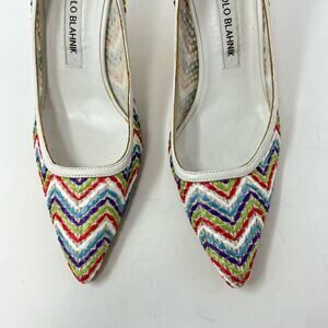 Add a bold pop of color to your wardrobe with these eye-catching Manolo Blahnik woven heels. Featuring a pointed toe and vibrant multicolor zigzag pattern, these designer pumps blend artisanal craftsmanship with playful elegance. Made with white leather trim and signature Manolo quality, these preloved shoes are perfect for events, summer outfits, or elevating everyday looks. A true statement piece for fashion-forward collectors and lovers of unique designer heels.