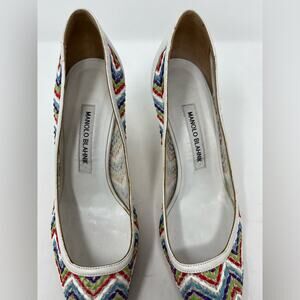 Manolo Blahnik Arina Pointed Toe Rainbow ZigZag Pump White Leather size 39 EU Woven