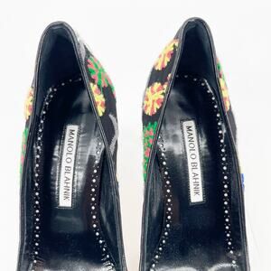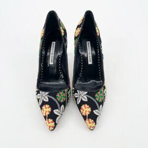 Manolo Blahnik BB 90 Black Floral Embroidered Fabric Pointed Toe Pumps IT 38