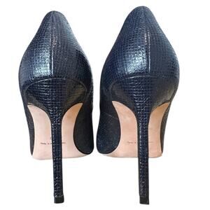 These are stunning in person! These are a beautiful textured navy blue leather that shine beautifully in the sun. These were gently pre loved, minor interior signs of wear and on outsole but exterior of shoes are pristine, these are in beautiful condition. Perfect for the office or wear with jeans or skirts and dresses. Leather Interior and outsole, Made in Italy