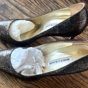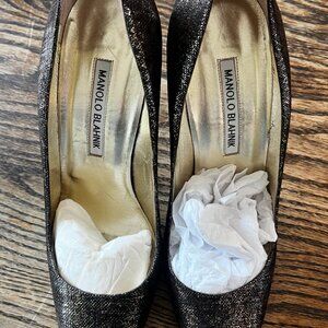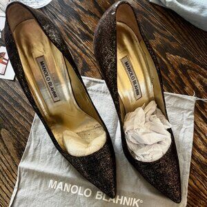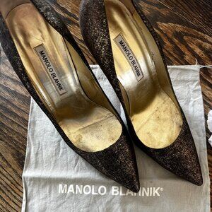Pictures do not do these shoes justice! Worn once, they are so beautiful. Gold and brown speckles catch the light in a gorgeous way, reading almost bronzey. Comes with manolo dust bag!