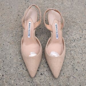Iconic Manolo Blahnik slingback mules in a timeless beige linen-style fabric.