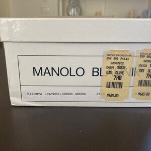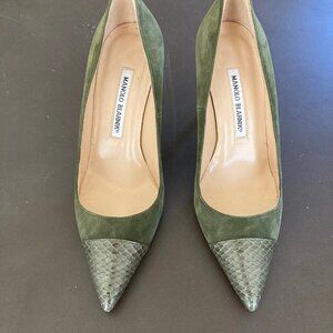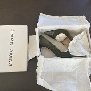Manolo Blahnik Bipunta Leather Suede Olive Green Pumps Heels IOB EU 37.5 US 7