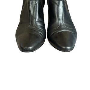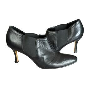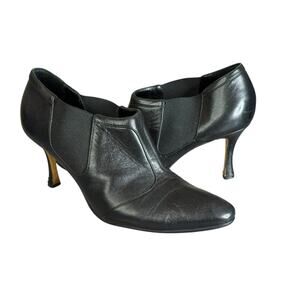 Manolo Blahnik booties, black leather ankle boots, band detail booties, designer shoes, European size 38, pointed toe, sculpted heel, modern elegance, italian craftsmanship, timeless wardrobe