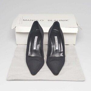 These chic and elegant Manolo Blahnik Black Crepe De Chine Pumps are a great addition to any wardrobe! Black satin uppers on a classic pump style make these must for any fashionista. Leather lined upper and a padded insole makes for a comfortable fit.