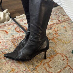 Black leather Manolo Blahnik below the knee leather boots- side zip. Leather is soft and buttery. These are great boots and great for day night and can be worn with jeans skirts and dresses. These boots are classic and timeless.