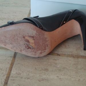 Manolo Blahnik patent leather black pumps with white stitching. Size 37. Worn 1 time and comes in box. Please review pictures carefully for condition.