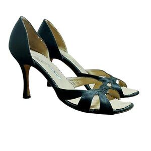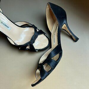 Manolo Blahnik Black Satin Heels Open Toe Sandals Evening Size 36.5