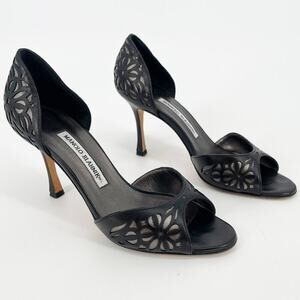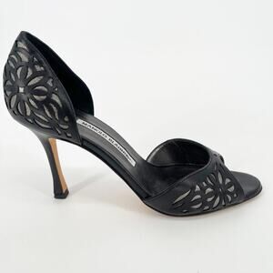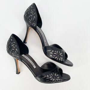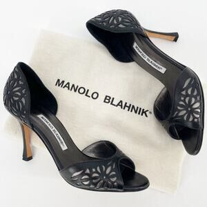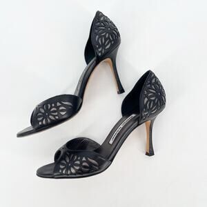 Manolo Blahnik Black Silver Floral Laser Cut Inlay D'Orsay Heel size IT 37.5